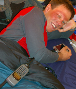 A sunburnt Paul Adler from Thuraya Recharge uses his Thuraya satellite phone to update a website during a mountaineering expedition in Kazakhstan.