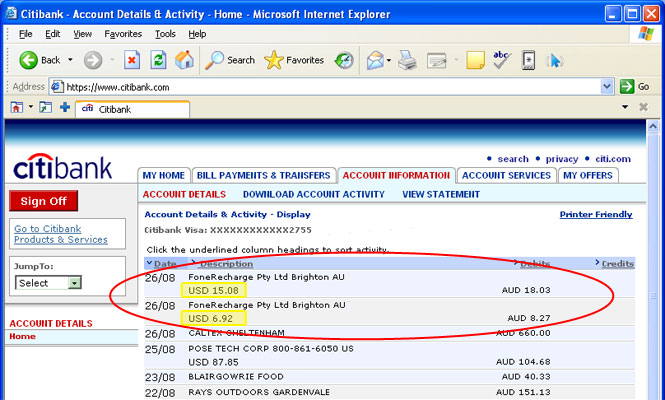 Check your credit card statement or call your bank to find out these amounts. The transactions will appear as Thuraya Recharge. In the example below the order was $22.00 and it was charged as US$15.08 and US$6.92.