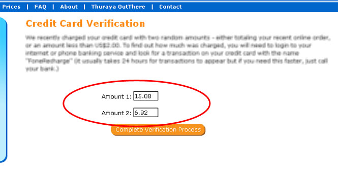 Come back to Thuraya Recharge, login and click on the Verify Credit Card link. Enter the amounts that appeared on your credit card statement in USD or your local currency.